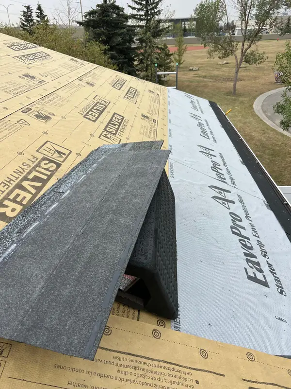 It involves the first time installation of a roof on a newly constructed house by installing underlayment, shingles and metal flashings.